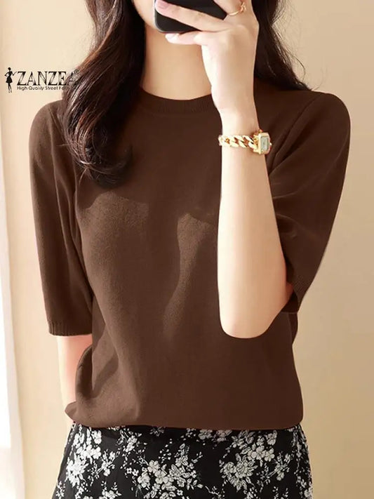 Women Knitted T Shirt Korean Fashion Half Sleeve Simple Tees 2024 Summer Round Neck Tunics Casual Loose Solid Basic Tops