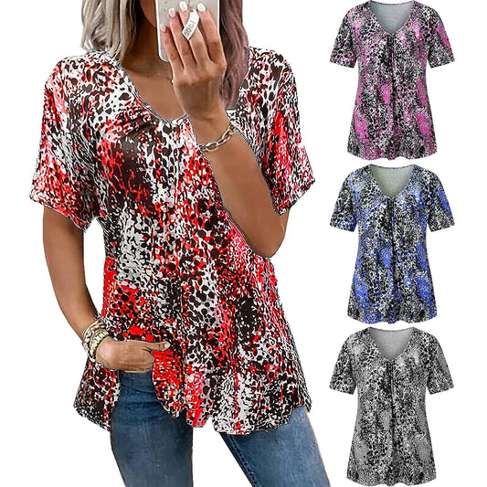 summer fashionable blouse digital print leopard print blouse chest pleated V neck short sleeve casual T-shirt women