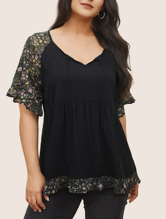 New Plus Size Women's Floral Mesh Stitching Jacket V Tie Decorative T-shirt