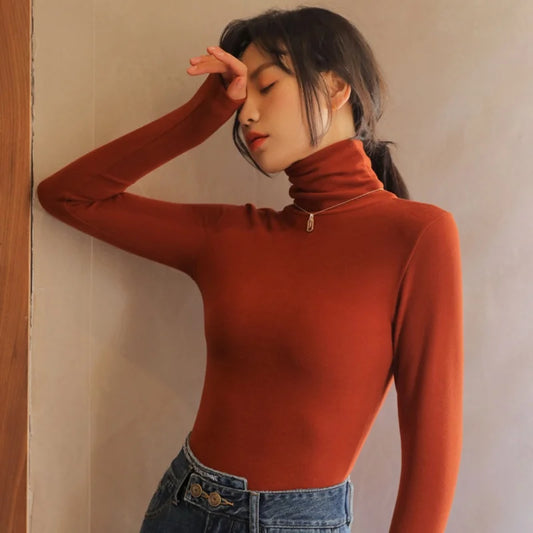 2024 Women Long Sleeve T Shirt Spring Autumn Winter Turtleneck Basic Tops Korean Casual Slim Pullover Elastic Base Tees Shirts